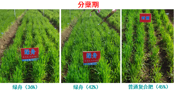 從田間試驗數據可知,“綠舟”功能肥在促進小麥苗期分蘗優勢明顯,小麥施用“綠舟”(42%)及“綠舟”(36%)功能肥苗期