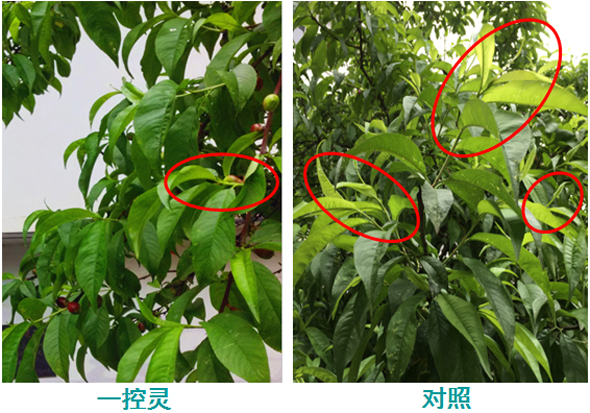 公司研發部于2016年3月24日開始在桃樹上進行試驗,試驗選用一控靈200倍液進行噴施,第一次噴施為謝花期,第二次噴施為坐果期。觀察時為第二次噴施后的第7天,已可見對控梢的良好效果。具體的試驗數據如下: